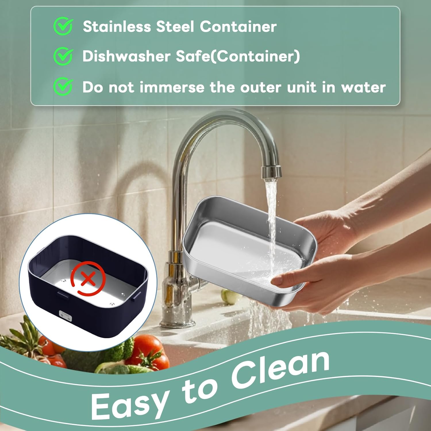 - 【Easy to Clean】The detachable stainless steel container, fork, spoon, and plastic compartment of this heated lunch box are dishwasher-safe, saving time and effort in your busy life. PS: Avoid water contact with the heating base to prevent short circuits, please wipe it with mild soapy water.